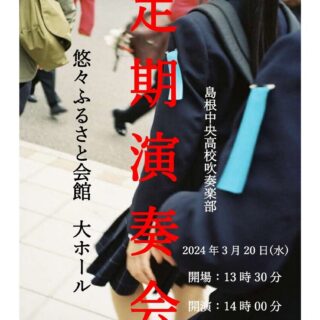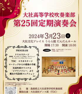 ・日 時 2024年3月23日(土) 18:00開演(17:30開場) ・会 場 大社文化ブレイスうらら館だんだんホール(出雲市大社町杵築南1338-9) ・入場料 無 料 ・お問合せ 島根県立大社高等学校吹奏楽部 周藤 保充 (TEL08...
