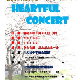 日 時 令和6年3月27日(水) 開 演 18:30 (開場18:00) 場 所 うらら館 だんだんホール 曲 目 大社中学校合唱部 2023年度Nコン課題曲「chessboard」 結 群青 その他 大社中学校吹奏楽部 2024年全日本吹...