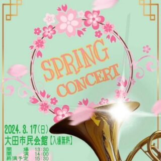 日 時 2024年3月17日(日) 13:30開場 14:00開演 (終演予定15:30) 場 所 大田市民会館大ホール 入場無料 賛助出演 大田一中吹奏楽部OBOG 主 催 大田一中吹奏楽部、保護者会 問い合わせ 大田一中吹奏楽部顧問(0...